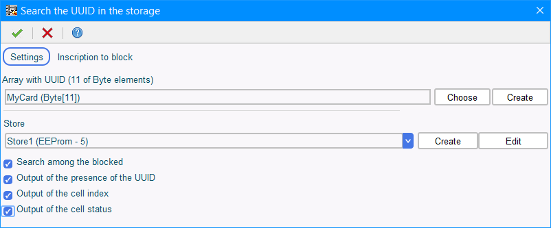 Sul fronte di salita dell'input "Find", nell'archivio selezionato verrà cercato l'UUID registrato nell'array selezionato. La ricerca verrà effettuata solo tra le celle con stato diverso da 0x00 e 0x01. Se è attivata la casella di controllo "Search among the blocked", nella ricerca verranno prese in considerazione anche le celle con lo stato 0x01 (bloccate).