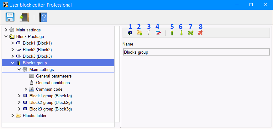 Questo ramo viene utilizzato per il raggruppamento logico dei blocchi inclusi nel pacchetto. Per i blocchi inclusi nel pacchetto, puoi creare parametri comuni separati, codice comune e condizioni generali che verranno applicati a tutti i blocchi inclusi nel gruppo. Il nome del gruppo è impostato su questo ramo (Figura 1).