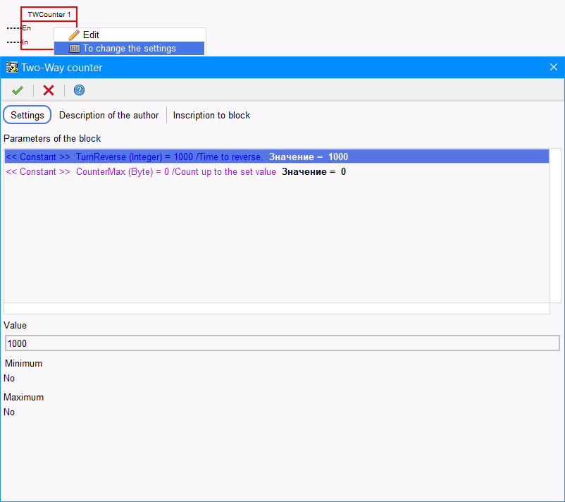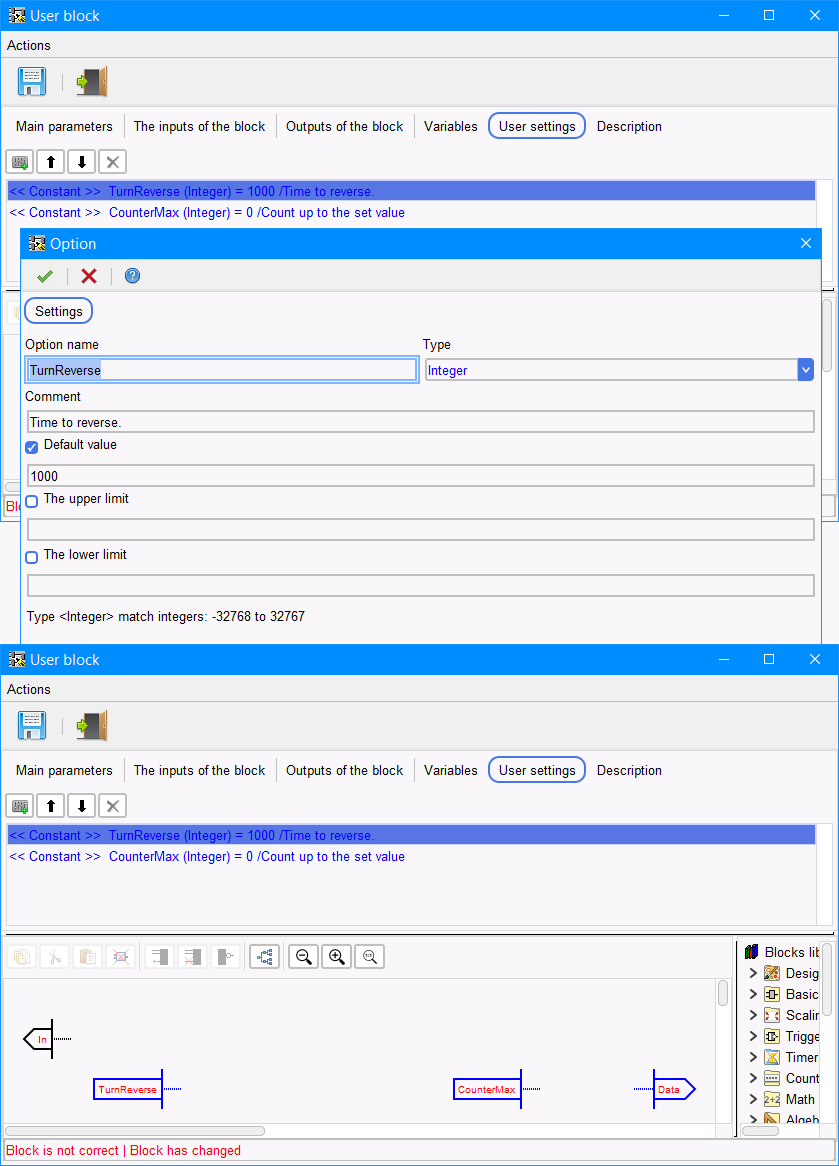 Il parametro blocco personalizzato FBD viene utilizzato per creare la possibilità di modificare i parametri del blocco quando lo si utilizza. Nell'editor viene creato e memorizzato nella scheda "User settings". Quando si crea un parametro, è necessario specificarne il tipo e il nome. È anche possibile impostare un valore predefinito. Se viene creato un parametro di tipo numerico, è possibile impostare un limite minimo e massimo. Inoltre, se necessario, è possibile creare un commento al parametro. Nello schema nell'editor, viene spostato mediante trascinamento e viene visualizzato come segue. Vediamo la voce che il blocco non è corretto è colorata in rosso, questo perché il parametro non è connesso