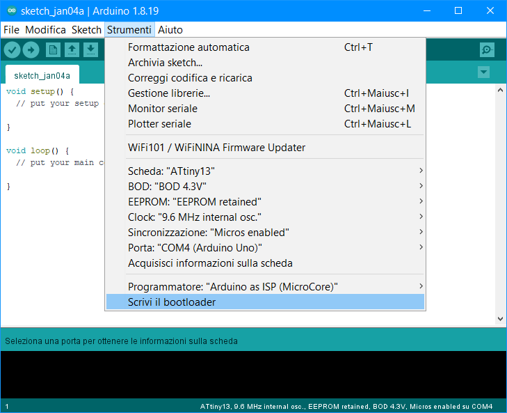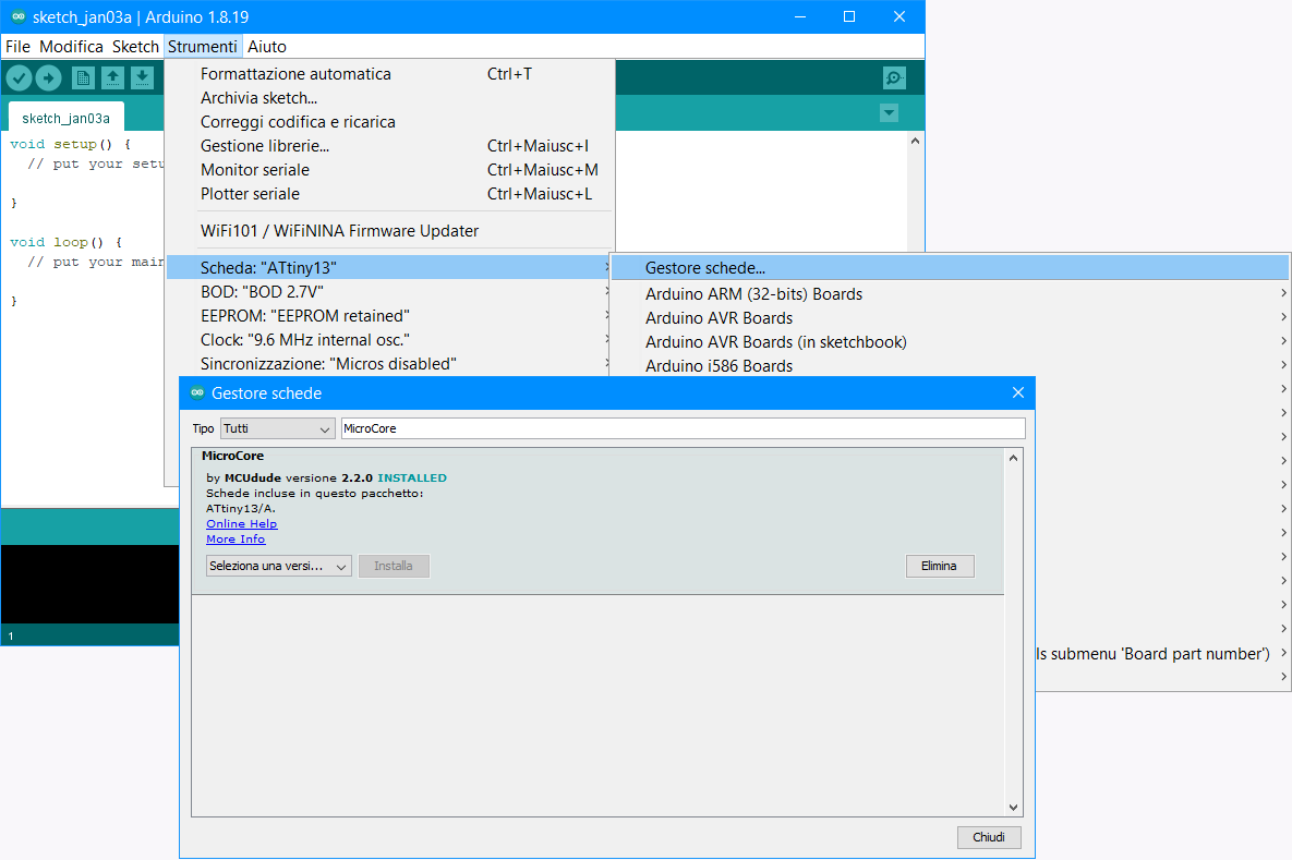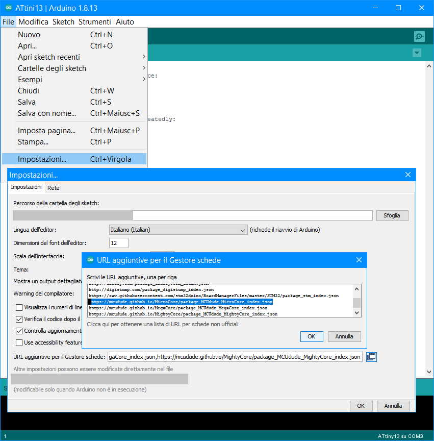 Installazione della scheda ATtiny13 in Arduino IDE.