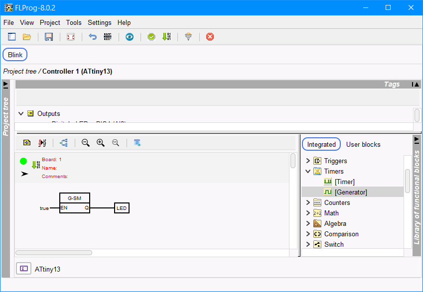 Dopo aver scritto il Bootloader, il microcontrollore ATtiny è pronto per la programmazione. Ora possiamo implementare l'esempio Blink in FLProg (Figura 7).