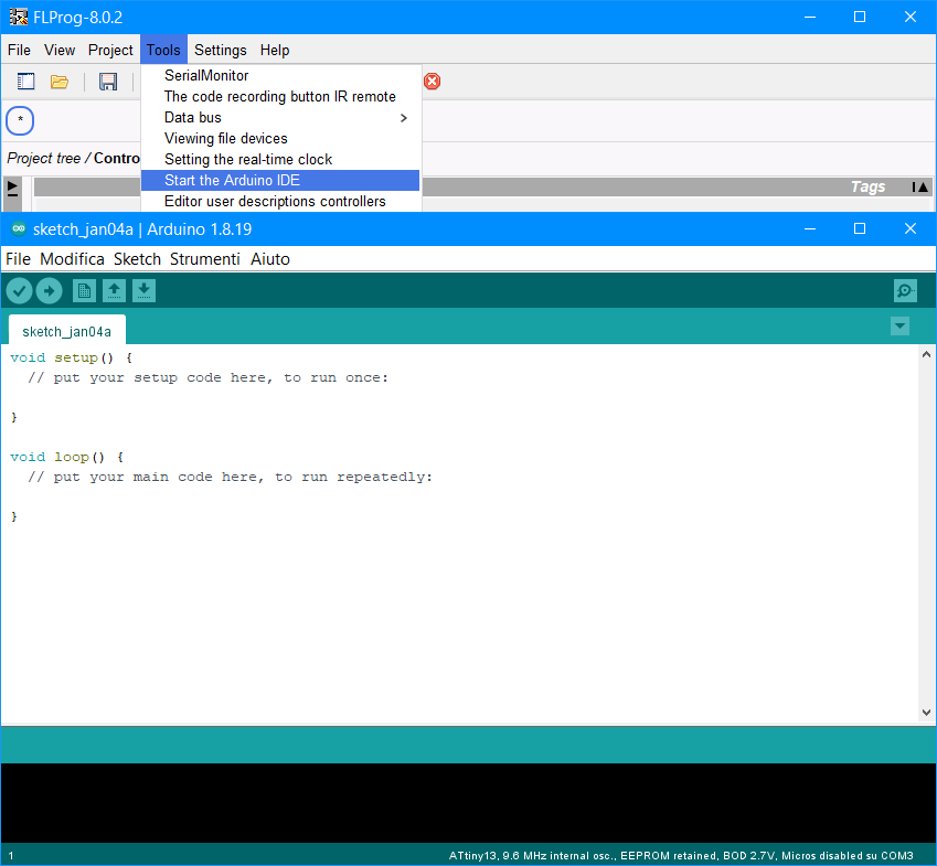 Questo è un esempio di come installare schede di supporto per schede non ufficiali di terze parti tramite URL nell'IDE di Arduino. Per lavorare con ATtiny13 tramite Flprog dobbiamo configurare Arduino IDE: Tools->Start the Arduino IDE (Figura 1).