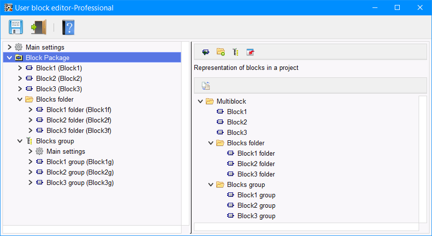 È possibile utilizzare l'editor della vista del blocco per impostare il tipo di visualizzazione del blocco nella libreria di blocchi personalizzata. Per impostazione predefinita, vengono visualizzati in un semplice elenco nell'ordine in cui sono stati aggiunti al multiblocco. Il nome della cartella principale corrisponde sempre al nome specificato nelle impostazioni principali del multiblocco. La rappresentazione dei blocchi in questo editor non ha nulla a che vedere con la loro posizione nell'albero dell'editor multiblocco e non lo influenza in alcun modo.