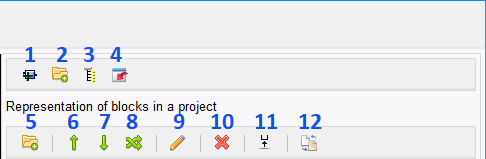 - Utilizzando il pulsante "Synchronize"(12), è possibile ricreare l'albero di visualizzazione in base all'albero dell'editor. Successive modifiche alla struttura dell'editor non modificheranno la struttura di visualizzazione fino a quando non si fa nuovamente clic sul pulsante "Synchronize"(12). I blocchi appena creati verranno aggiunti alla fine dell'elenco dei blocchi.