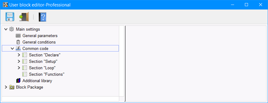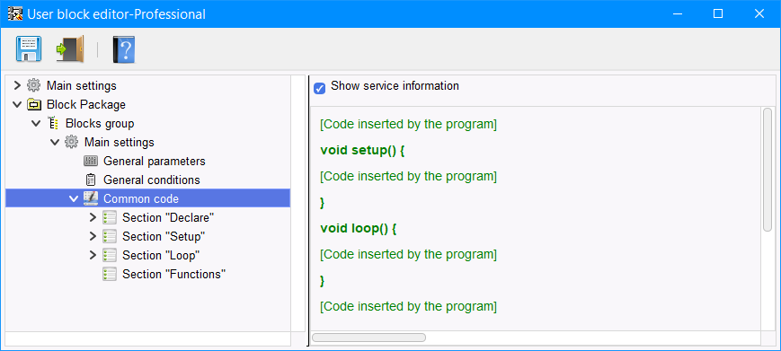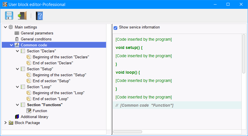 Ogni sezione è suddivisa in sezioni a seconda di dove è inserito il codice nella sezione. Il codice da "Beginning of the section" viene inserito nella sezione corrispondente dello schizzo prima del codice che viene inserito dal compilatore del programma per i blocchi standard. Il codice da "End of section" viene inserito nella corrispondente sezione dello sketch dopo il codice che viene inserito dal compilatore del programma per i blocchi standard. Il codice della sezione "Functions" è sempre inserito alla fine dello sketch (Figura 9).