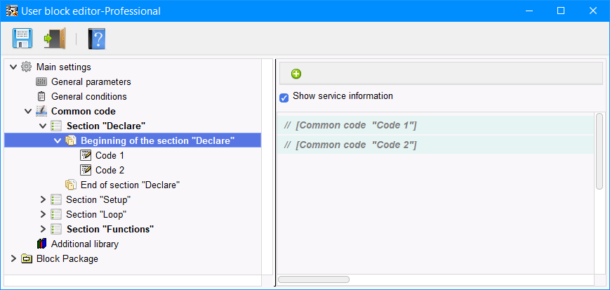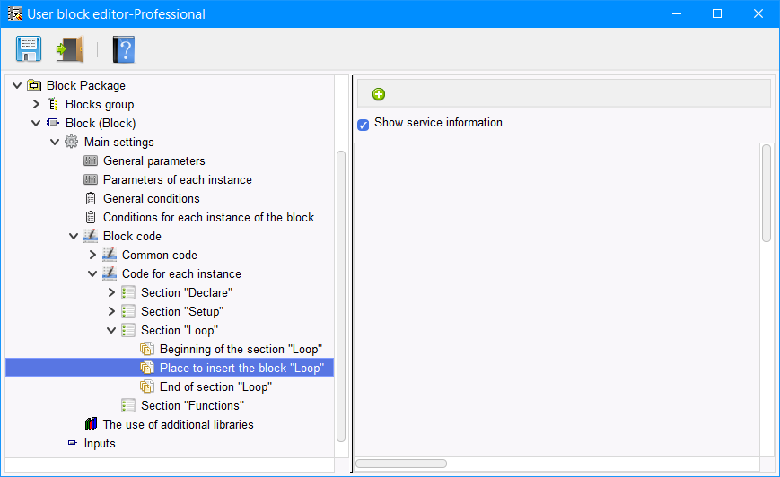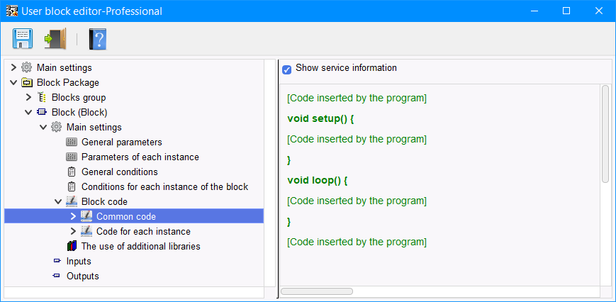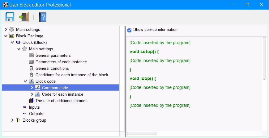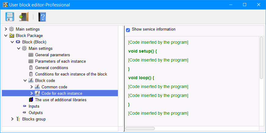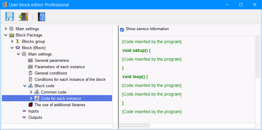 Per il codice di ogni istanza è presente una sezione aggiuntiva nella sezione "Loop" "Place to insert the block". Il codice di questa sezione viene inserito nella sezione loop dello sketch nel punto di inserimento di una specifica istanza del blocco (Figura 10).